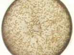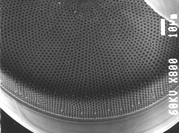Coscinodiscus wailesii. oblique SEM . Visible are: girdle bands, two regular rows of rimoportulae (2-3 areolae from margin & at valve face/mantle junction), one irregular row of rimoportulae near center, irregular hyaline central area. scale bar is 10µm.